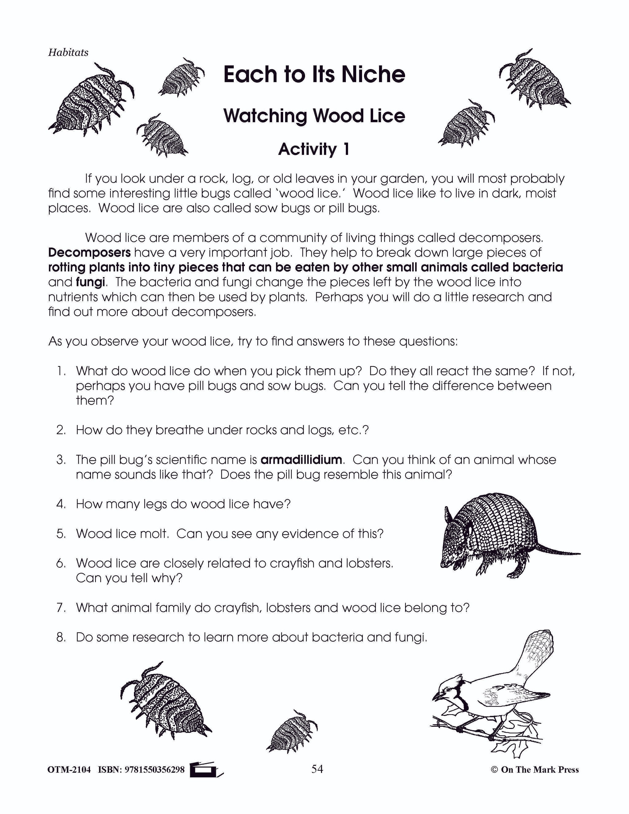 This lesson plan involves the student's participation in an investigation of woodlice. This investigation has two separate activities. Students will identify through observation, various factors that affect plants and animals in a specific habitat. 11 pages including an answer key.