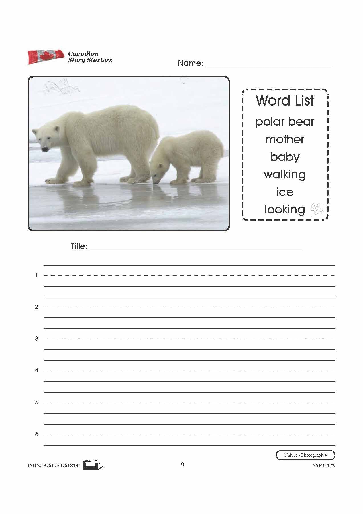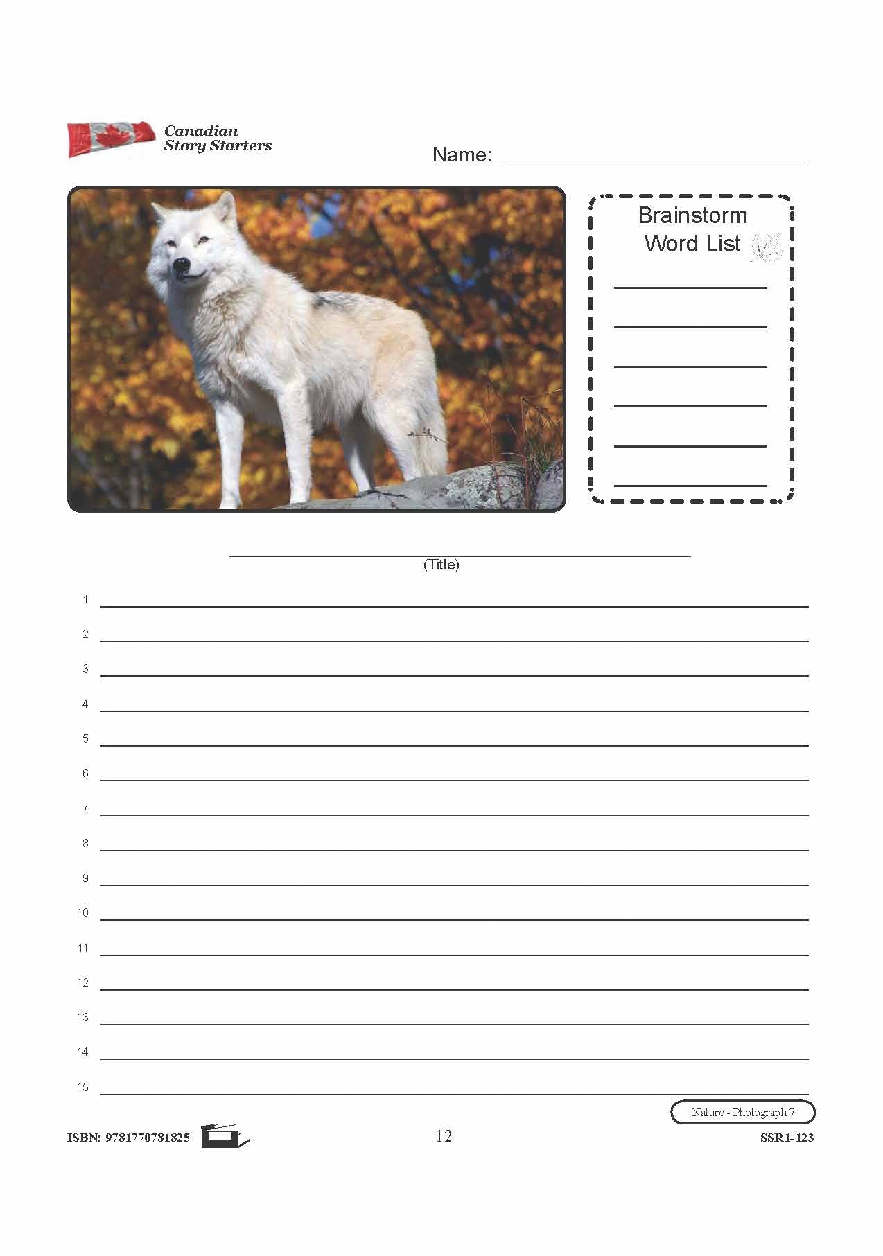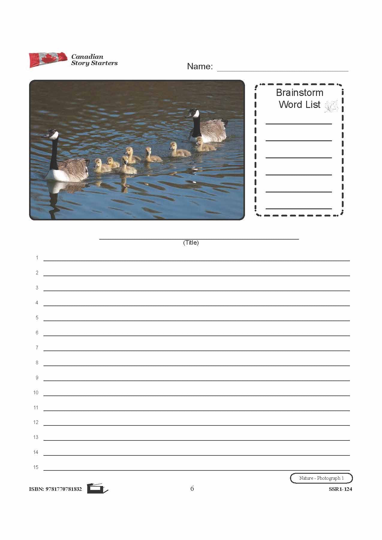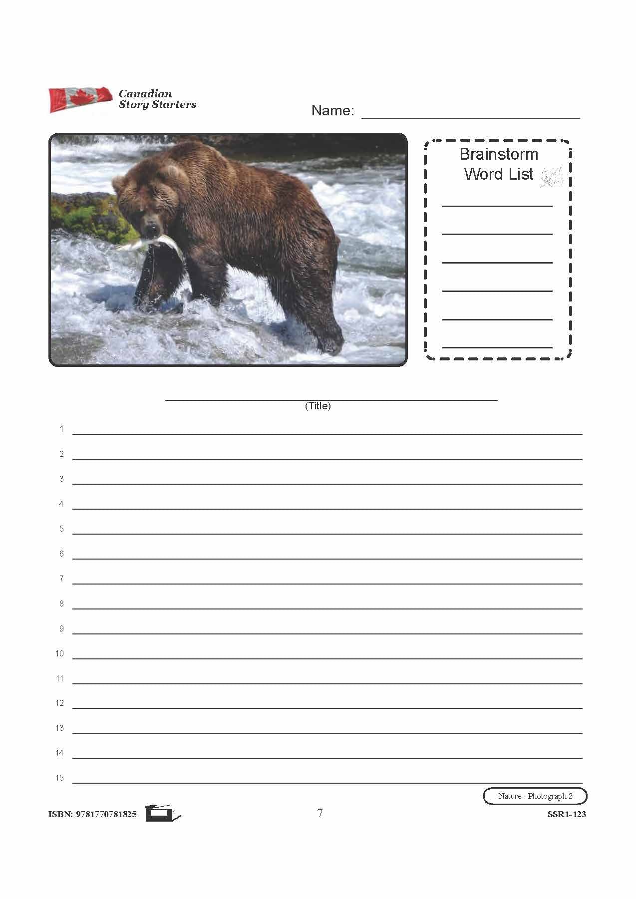 10 story starters contain photographs to inspire student's creativity and knowledge pertaining to Canada's Nature. Each story starter worksheet includes a photograph and corresponding word list, a blank line for the story's title, and numbered blank lines for the story...
