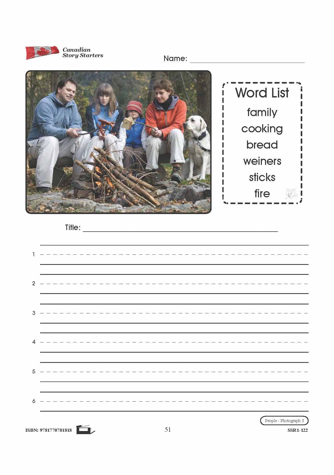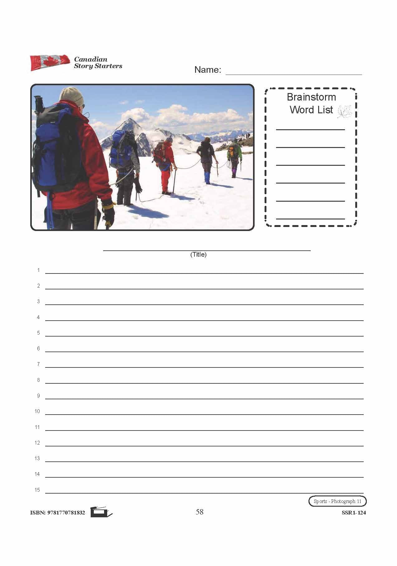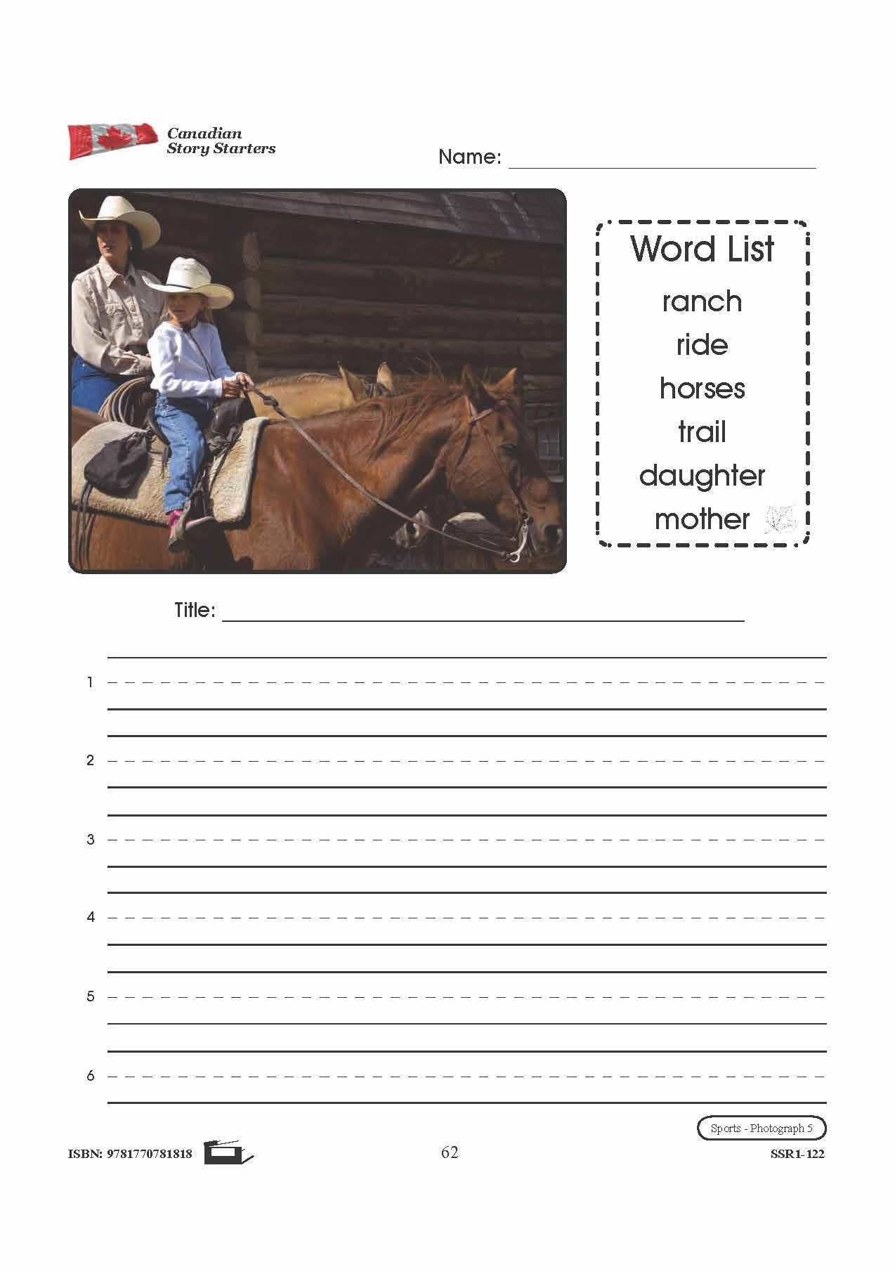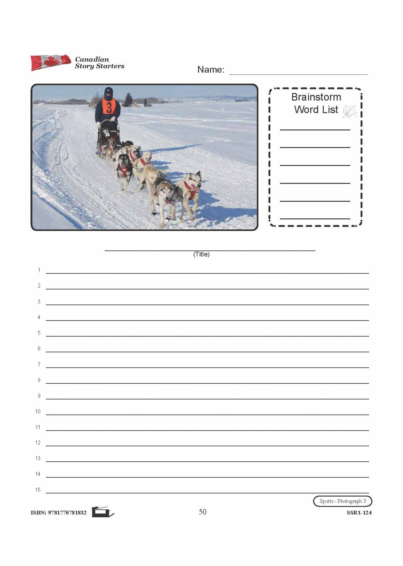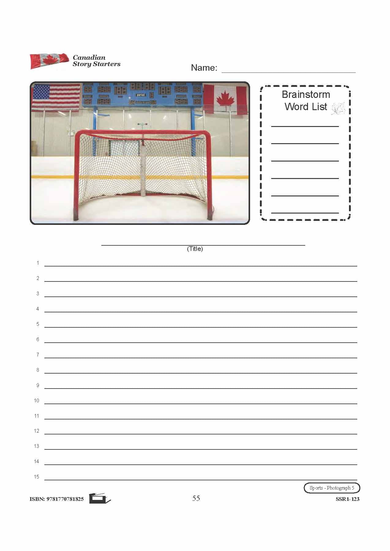 5 story starters contain photographs to inspire student's creativity and knowledge pertaining to Canadian Sports. Each story starter worksheet includes a photograph and corresponding word list, a blank line for the story's title, and numbered blank lines for the story...