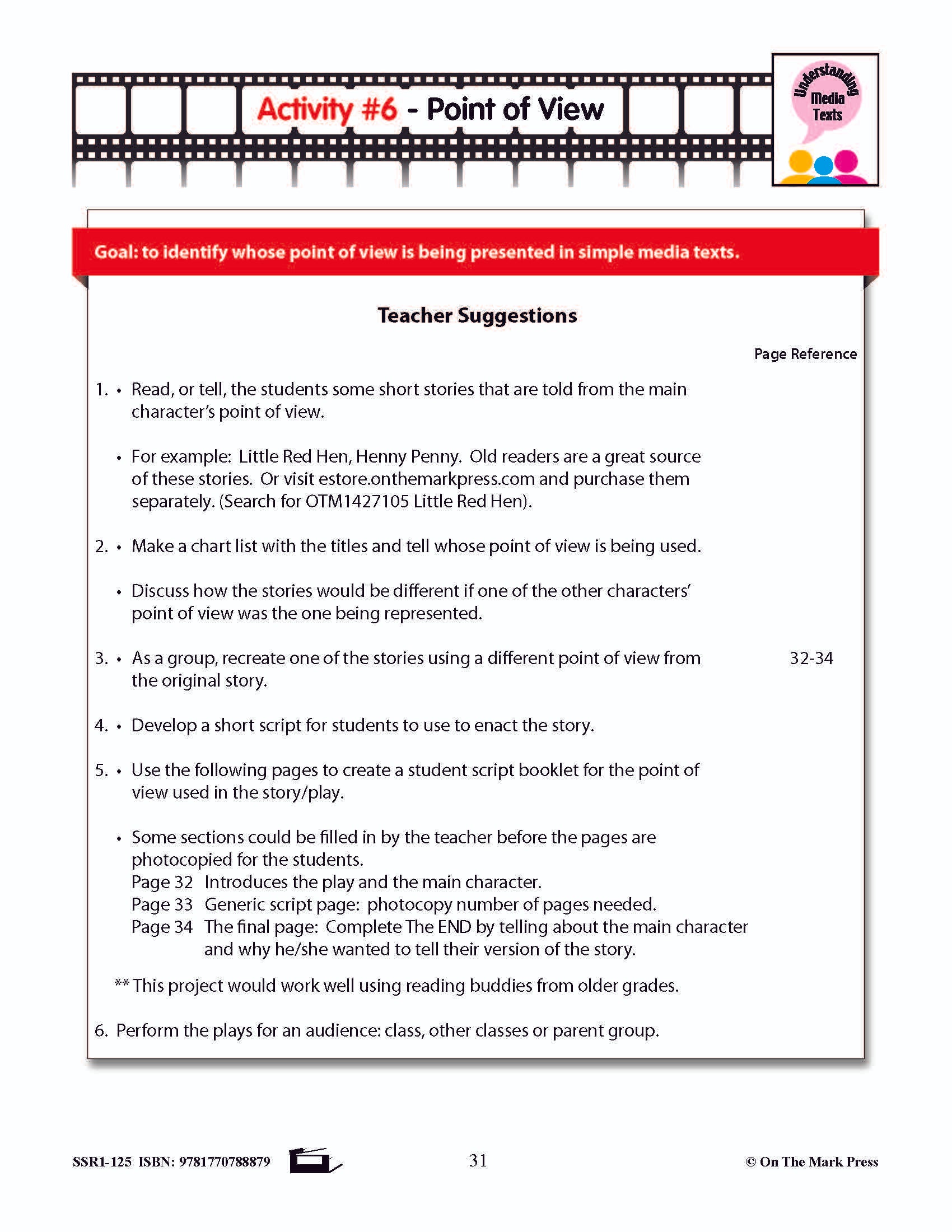 Students will identify whose point of view is being presented in simple media texts. They will observe with their senses, evaluate information and relate media to personal experiences, actions and behaviours.