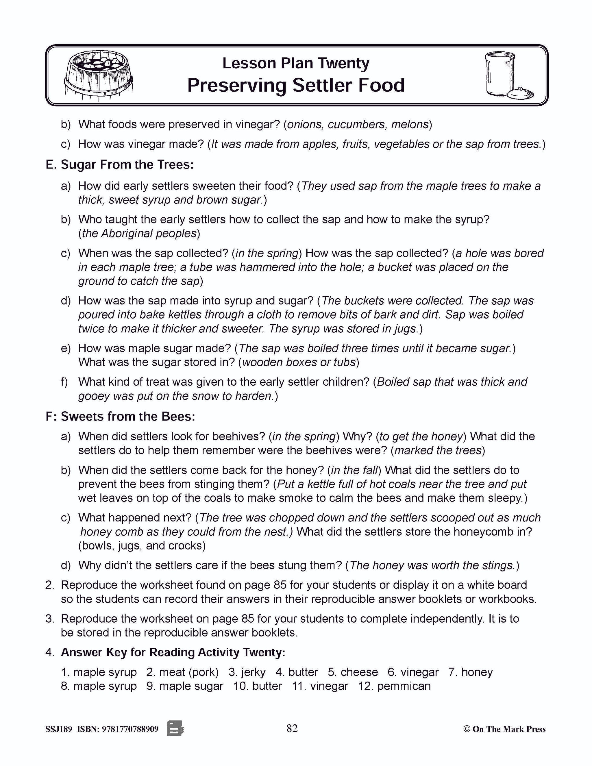 In this lesson, students will answer questions about meat, butter, cheese, salting and pickling, sugar from the trees, and sweets from the bees. Teaching instructions, reading information page, and 1 worksheet with answer key. This book supports many of the...