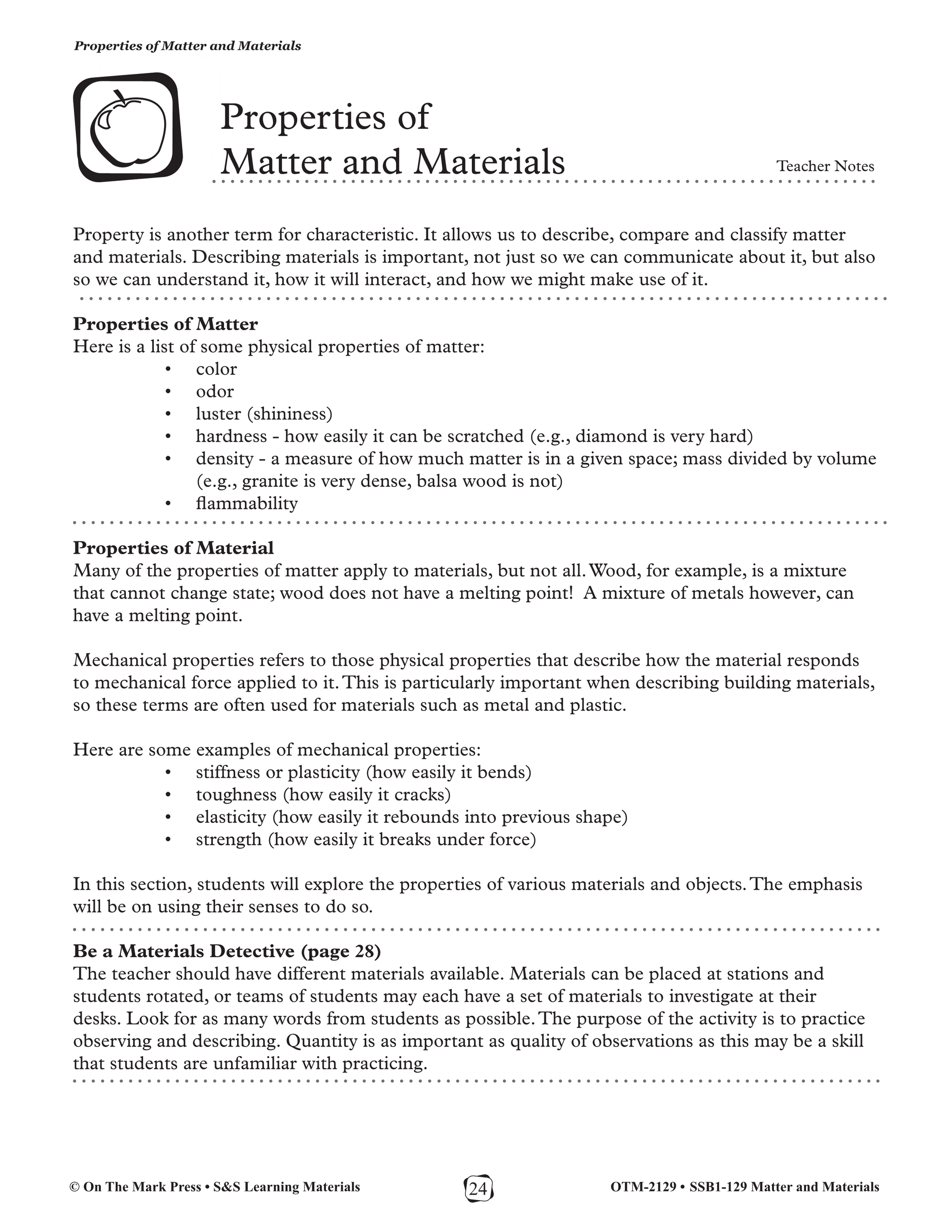 In this lesson plan, students will explore the properties of various materials and objects, and they will practice observing and describing. Teacher notes, with 5 experiments with worksheets, plus an answer key complete the lesson. 16 pages Meets the British...